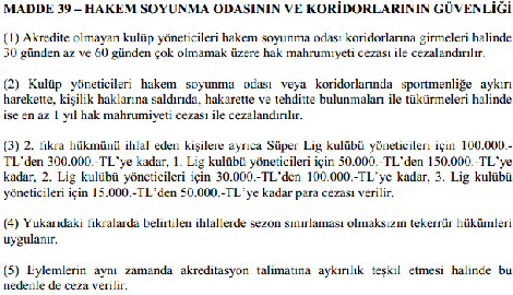 Futbol Disiplin Talimatı'nın 39. maddesi (Hakem oyunma odasının ve koridorlarının güvenliği) üzerinde de değişikliklere imza atan Türkiye Futbol Federasyonu, yaptırımların dozunu da arttırdı. Değişiklikler içerisinde en çarpıcı olanı ise eski talimatlarda 'tekerrür' bir sezon içerisinde olduğu zaman uygulanıyordu, yeni talimatlarda ise bundan sonraki tüm eylemlerin farklı sezonlarda dahi olsa tekerrür olarak kabul edileceği ve cezai yaptırımların da buna göre uygulanacağı yönünde oldu.