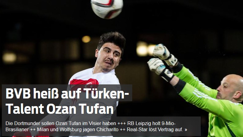 Adı daha önce La Liga ekiplerinden Atletico Madrid için de geçen Ozan Tufan'ı bu kez Bundesliga temsilcisi Borussia Dortmund gündemine aldı. Genç oyunculara yaptığı yatırımla bilien Jurgen Klopp'un çalıştırdğı Dortmund'un, Ozan Tufan ile ilgili olumlu rapor aldığı ve 20 yaşındaki genç oyuncuyu transfer listesine eklediği ortaya çıktı.