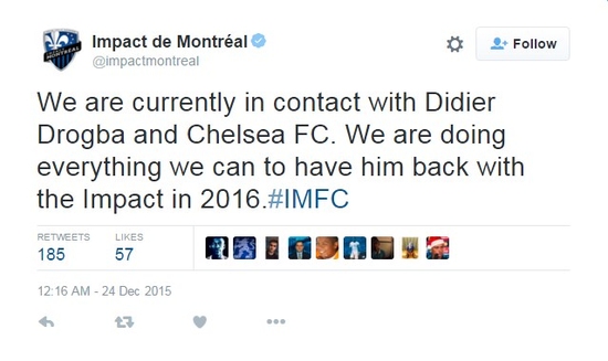 Montreal Impact, kulübün resmi twitter hesabından yaptığı açıklamada, "Şu an Chelsea FC ve Didier Drogba ile görüşme halindeyiz. Drogba'yı 2016 yılında da Montreal'e geri getirmek için her şeyi deniyoruz" ifadelerini kullandı.