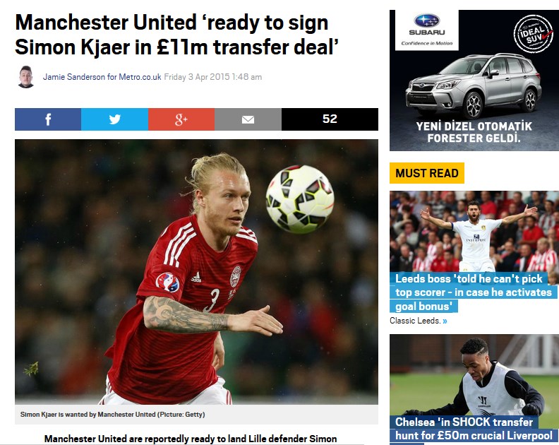 Louis van Gaal önderliğinde gelecek planları yapan Kırmızı Şeytanlar'ın savunmaya Lille'de forma giyen Danimarkalı savunma oyuncusu Simon Kjaer'i transfer edeceği ortaya çıktı.