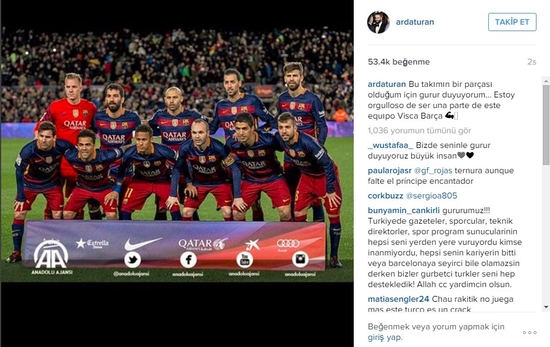 Arda Turan, daha sonra instragram hesabından yaptığı paylaşımda; "Bu takımın bir parçası olduğum için gurur duyuyorum. Visca Barça" ifadelerini kullandı.