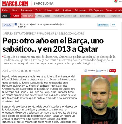 İspanya'nın yüksek tirajlı gazetelerinden Marca'nın haberine göre; Katar Futbol Federasyonu gelecek sezondan itibaren Guardiola'yı takımın başına getirmek istiyor. Başarılı teknik adama yapılan teklif ise 36 milyon avro... Bu teklife Guardiola'nın ne cevap vereceği merakla beklenirken, haberin dünyadaki yankıları ise hız kesemeden büyümeye devam ediyor.