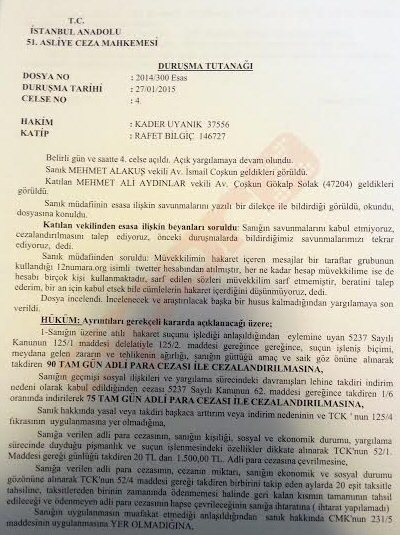 Mahkeme, 12numara.org adlı twitter üzerinden Mehmet Ali Aydınlar'a hakaret suçu işlendiği gerekçesiyle verdiği 90 tam gün adli para cezasını sanık Mehmet Alakuş'un yargılama süresinceki davranışlarını gözönüne alarak 75 tam gün adli para cezasına indirdi. Bu ceza mahkeme tarafından 1500 tl para cezasına çevrilirken cezanın ertelenmesine yer olmadığına karar verildi.