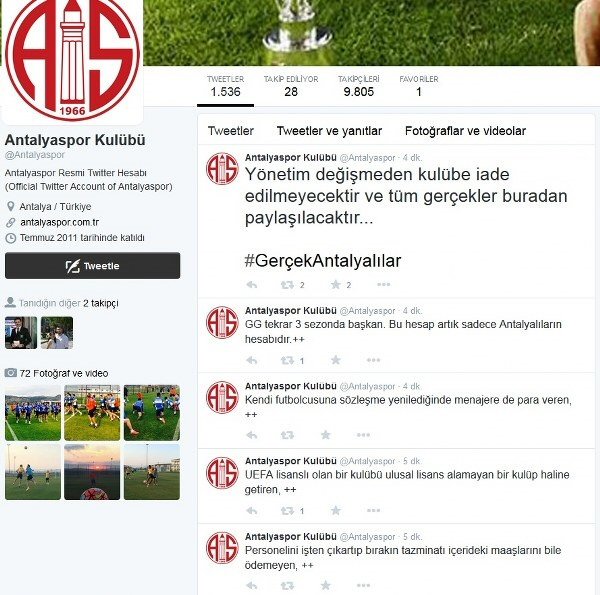 Öte yandan hacklenen hesap üzerinde yapılan paylaşımda, "Personelini işten çıkartıp, bırakın tazminatı, içerideki maaşlarını bile ödeyemeyen, UEFA lisanslı olan bir kulübü, ulusal lisans alamayan bir kulüp haline getiren, kendi futbolcusuna sözleşme yenilediğinde menajere de para veren GG (Gültekin Gencer) 3. sezonda başkan. Bu hesap artık Antalyalıların hesabıdır. Yönetim değişmeden kulübe iade edilmeyecektir. Tüm gerçekler buradan paylaşılacaktır" ifadeleri kullanıldı.