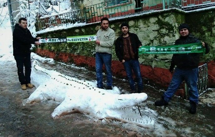 Orhangazi'nin Paşapınar Mahallesi'nde yaşayan Bursaspor taraftarı gençler, kardan timsah yaptılar, timsahın üzerine de Bursaspor atkısı koydular.