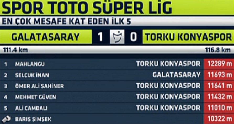 Konyaspor, Galatasaray'a oranla 5.2 km daha fazla koşu mesafesine ulaşmasına karşın maçık kaybetti. Maçın en çok koşan ismi May Mahlangu olurken, ilk 5'e Galatasaray'dan sadece Selçuk İnan girebildi.