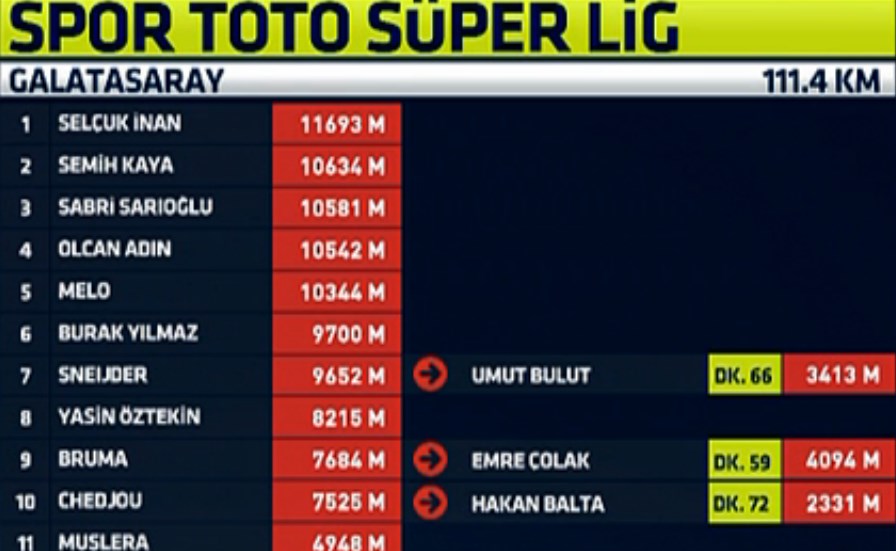 Galatasaray'da 10 kilometreyi aşan sadece 5 oyuncu oldu. Selçuk İnan dışında , Semih Kaya, Sabri Sarıoğlu, Olcan Adın ve Felipe Melo sarı kırmızılıların en çok koşanları oldu.