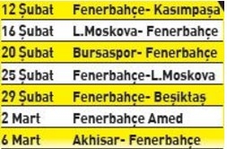 12 Şubat'ta Kasımpaşa ile başlayacak zorlu maraton, 6 Mart'ta Akhisar karşılaşmasıyla son bulacak. Şubat ayına Antalya yenilgisiyle başlayan sarı-lacivertliler, Amed'le 3-3 berabere kaldığı çeyrek finalin rövanşını da 24 günlük periyotta oynayacak.