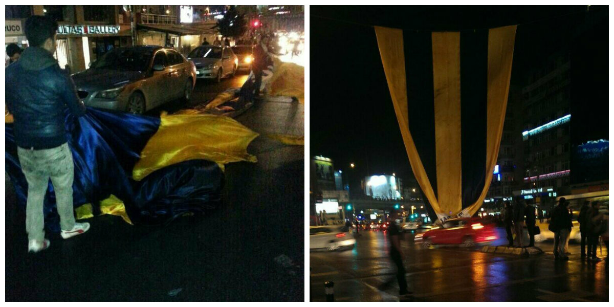 Galatasaraylı taraftarların Bağdat Caddesi yürüyüşünün ardından sarı kırmızılı taraftarların uğrak noktası olarak bilinen Mecidiyeköy'e dev bir Fenerbahçe bayrağı asıldı. Ardından harekete geçen Galatasaraylı taraftarlar Mecidiyeköy meydanına asılan Fenerbahçe bayrağını indirdi.