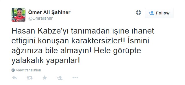 Ömer Ali Şahiner ise; "Hasan Kabze'yi tanımadan işine ihanet ettiğini konuşan karaktersizler!! İsmini ağzınıza bile almayın! Hele görüpte yalakalık yapanlar" diyerek sert çıktı.