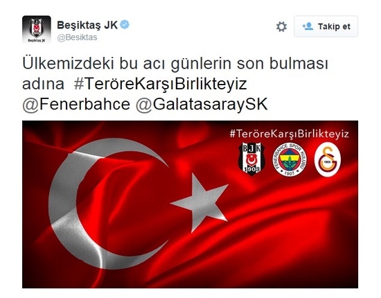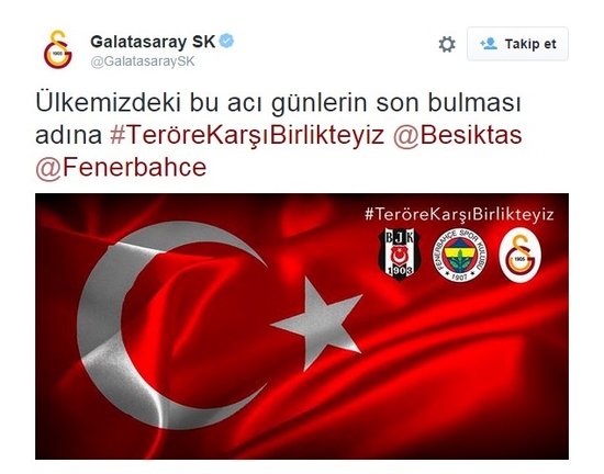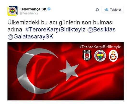 Kulüpler; Twitter, Facebook, Instagram ve Google Plus'ta Türk bayrağı ve kulüplerin armalarının bulunduğu görselde, "Teröre karşı birlikteyiz" mesajı verdi.