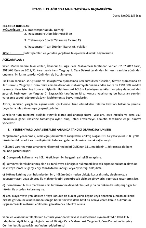 "Tüm kamuoyunun bildiği üzere Şike Davasında İstanbul 16. Ağır Ceza Mahkemesi tarafından verilen karar, Yargıtay 5. Ceza Dairesi tarafından, 17.01.2014 tarihinde, bazı sanıklar yönünden onanmış ve karar kesinleşmiştir.