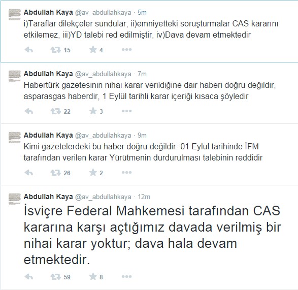 Kendisine ait twitter hesabıdan bir açıklama yapan Abdullah Kaya; "İsviçre Federal Mahkemesi tarafından CAS kararını karşı açtığımız davada verilmiş nihai bir karar yoktur; dava hala devam etmektedi.r Kimi gazetelerdeki bu haberler doğru değildir" dedi.