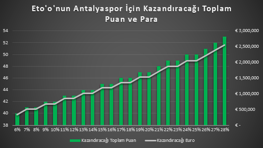 Son 10 sezona baktığımda, Süper Lig’e yeni çıkan takımlar ilk sezonlarında ortalama 38 puan kazanıyorlar. Bu sebeple, Eto’o’suz bir Antalyaspor’un 38 puan kazanacağını varsayalım. Şimdi işin içine Eto’o’yu ekleyelim. Eto’o’nun son iki sezondaki performansının gelecek sezon yapabileceklerinin tam aralığını gösterdiğini düşünürsek, Eto’o’nun Antalyaspor’un toplam puanına %6-%28 katkıda bulunacağını tahmin edebiliriz. Alttaki grafik Eto’o’nun katkıda bulunabileceği her yüzde için takımına ne kadar puan ve para kazandıracağını gösteriyor.