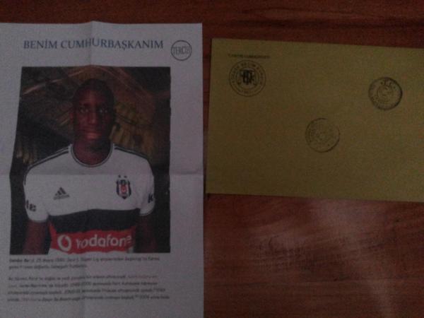 Türkiye Cumhuriyetinin 12.Cumhurbaşkanı'nı seçmek üzere sandığa giden Türkiye'den ilginç bir hikaye daha sosyal medyaya yansıdı. Fanatik Beşiktaşlı olan bir seçmen oyunu sandığa beraberinde götürdüğü "Benim Cumhurbaşkanım Demba Ba" yazılı kağıda bastı ve bunu ölümsüzleştirdi.