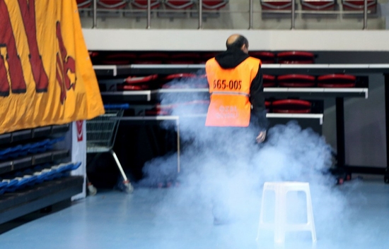 Galatasaraylı oyuncuların hakem Bülent Bozkurt'a itiraz ettiği sırada Fenerbahçeli bir taraftarın atkı gösterdiği iddiasıyla Galatasaraylı taraftarlar tepki gösterdi. Galatasaray taraftarları sahaya yabancı maddeler atarak, salonda bulunan Fenerbahçe bayrağını sökerek aşağı attı. Karşılaşmaya ara verilmeden önce 2-0 Fenerbahçe Grundig'in üstünlüğü vardı. Verilen aranın ardından maç yeniden başladı. 3. seti de kazanan Fenerbahçe mücadeleden 3-0 galip ayrıldı.