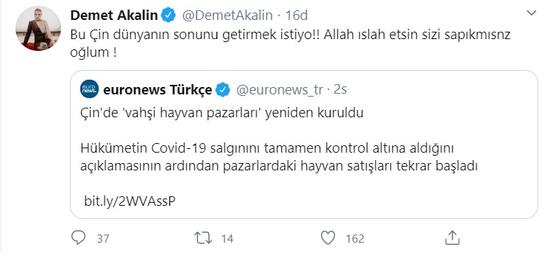 Demet Akalın, koronavirüs salgınını büyük oranda atlatan Çin'de vahşi hayvan pazarlarının yeniden kurulmasına twitter'dan yazdıklarıyla isyan etti.
