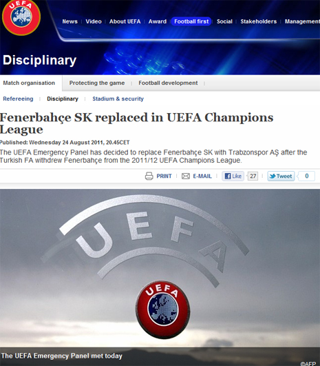 UEFA, internet sitesinde yayımlanan açıklamasında, UEFA Başkanı ile İcra Komitesi'nin 4 üyesinden oluşan Acil Durum Paneli'nin, Türkiye Futbol Federasyonunun men kararını almasının ardından toplandığını ve Avrupa Şampiyonlar Ligi'nde yarın belirlenecek gruplara, Süper Lig'de geçen sezonu ikinci sırada tamamlayan Trabzonspor'un dahil edilmesini kararlaştırdığını bildirdi.