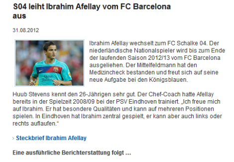 Afellay transferi hakkında açıklamalarda bulunan Schalke04 Sportif Direktörü Heldt ise gelişmeleri doğruladı ve detaylar halledildikten sonra Hollandalı oyuncunun 10 milyon euronun altında bir satın alma opsiyonuyla kiralanacağını belirtti.