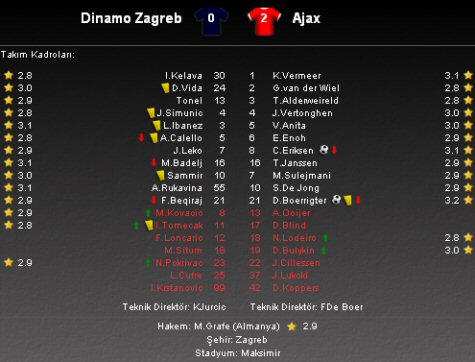 UEFA Şampiyonlar Ligi D Grubu'nda Dinamo Zagreb kendi sahasında Ajax'ı konuk etti. Konuk takım mücadeleden 2-0 galip ayrılmayı başardı.
