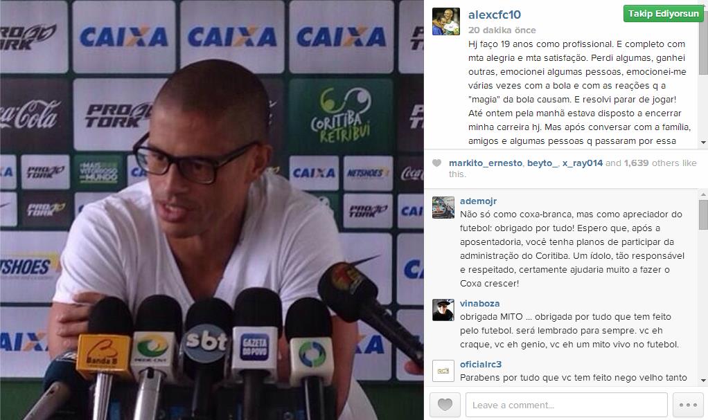 Öte yandan Coritibalı bazı taraftarların Alex de Souza'nın futbolu bırakmaması için kampanya başlattığı ifade edildi.