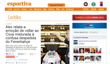 Fenerbahçe'den ayrılan ve eski kulübü Coritiba ile 2 yıllık sözleşme imzalayan Alex de Souza, sarı-lacivertli günlerine dair röportajlar vermeye devam ediyor.