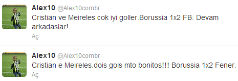 Mönchengladbach deplasmanında ilk yarıyı Fenerbahçe'nin 2-1 önde kapatmasının ardından twitter üzerinden takipçileriyle "Cristian ve Meireles cok iyi goller.Borussia 1x2 FB. Devam arkadaslar!" yazısını paylaşan Alex, böylelikle sarı lacivertli futbolcuların yanında olduğunu dile getirdi.