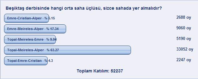 Her Fenerbahçeli taraftar geniş orta saha rotasyonundan 3 farklı oyuncunun takım için daha yararlı olacağını düşünürken, Fenerbahçe taraftarlarının internetteki toplanma adreslerinden biri olan SuperFB.com, bu konuyla ilgili özel bir anket yaptı. Taraftarlara "Beşiktaş derbisinde hangi orta saha üçlüsü sahada yer almalıdır" diye soruldu ve toplam 52.237 taraftar bu oylamaya katıldı.