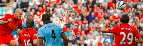 Liverpool, City'nin baskısını kırmak için çaba gösterirken bir anda öne geçti. Steven Gerrard'ın kullandığı köşe vuruşuna iyi yükselen Martin Skertel ilk yarının bitimine 10 dakika kala kafa vuruşuyla takımını öne geçirdi.