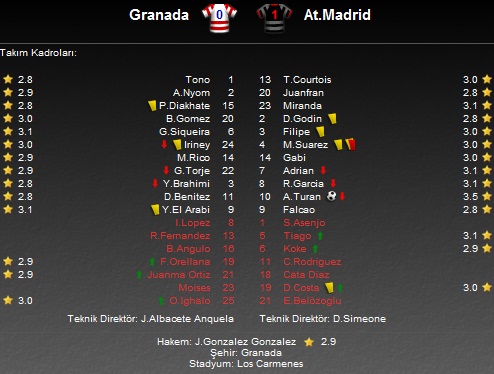Estadio Nuevo Los Carmenes Stadı'nda oynanan karşılaşmada Atletico Madrid 1-0 galip geldi. Diego Simeone'nin ekibine galibiyeti getiren golü 61. dakikada A Milli yıldızımız Arda Turan kaydetti. Milli futbolcumuz Arda Turan, Granada karşısında fileleri havalandırarak gol sayısını 4'e çıkarttı.