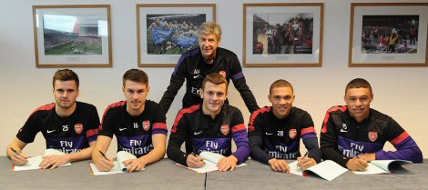 Premier Lig ekiplerinden Arsenal 5 genç oyuncusuyla uzun süreli kontratlar imzalayarak geleceğini teminat altına aldı. Londra ekibi, Jack Wilshere, Alex Oxlade-Chamberlain, Kieran Gibbs, Aaron Ramsey ve Carl Jenkinson ile sözleşme tazeledi.