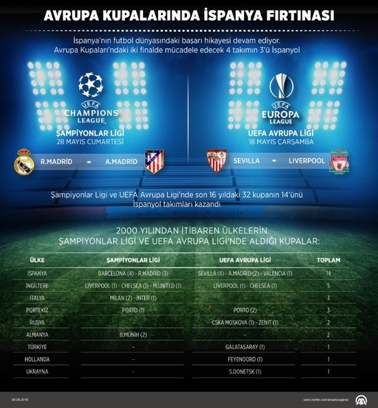 İspanya’nın futbol dünyasındaki başarı hikayesi devam ediyor. Avrupa kupalarındaki iki finalde mücadele edecek 4 takımın 3’ü İspanyol.