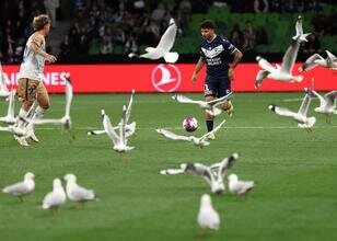Avustralya A-League'de Melbourne Victory ile Newcastle Jets arasında oynanan maçta, son dakikalarda sahayı basan martılar oyunu durdurarak karşılaşmaya damga vurdu.