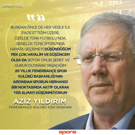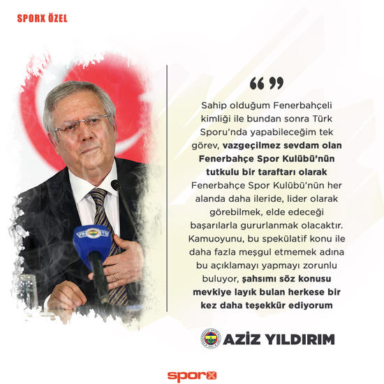 Türk sporunda aktif olarak görev almamayı düşündüğünü vurgulayan Yıldırım, "Ancak bundan önce de her vesile ile ifade ettiğim üzere, özelde Türk Futbolu'nda, genelde Türk Sporu'nda hayata geçirmeyi düşündüğüm pek çok hayalim ve düşüncem olsa da, büyük onur, şeref ve gurur duyarak yaşadığım 20 yıllık Fenerbahçe Spor Kulübü Başkanlığı'nın ardından sporun herhangi bir noktasında aktif olarak yer almayı düşünmüyorum. Sahip olduğum Fenerbahçeli kimliği ile bundan sonra Türk Sporu'nda yapabileceğim tek görev, vazgeçilmez sevdam olan Fenerbahçe Spor Kulübü'nün tutkulu bir taraftarı olarak Fenerbahçe Spor Kulübü'nün her alanda daha ileride, lider olarak görebilmek, elde edeceği başarılarla gururlanmak olacaktır.Kamuoyunu, bu spekülatif konu ile daha fazla meşgul etmemek adına bu açıklamayı yapmayı zorunlu buluyor, şahsımı söz konusu mevkiye layık bulan herkese bir kez daha teşekkür ediyorum" ifadelerini kullandı.