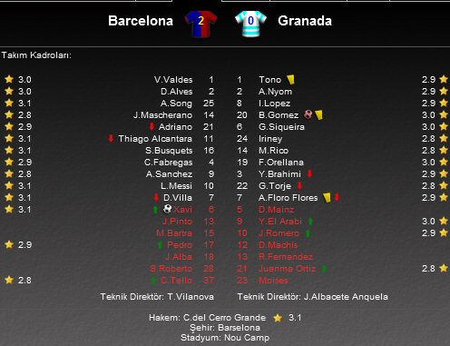 Karşılaşmada genel olarak vasat bir performans sergileyen Katalan ekibi, oyuna sonradan giren Xavi'nin 87. dakikada attığı golle maçta 1-0 öne geçti. Barça'nın 2. golü ise Granadalı Borja Gomez'in son dakikada kendi kalesine attığı golle geldi. Karşılaşma 2-0 Barcelona lehine sonuçlandı.