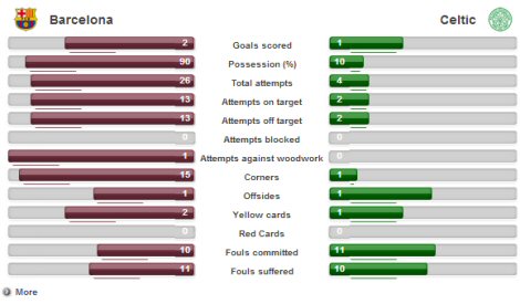 Nou Camp'ta Celtic'e top göstermeyen ve maç boyunca paslarıyla baş döndüren Barcelona takımı, maç boyunca yüzde 90 oranında topla oynama yüzdesi yakalayarak mucize bir istatistiğin altına imza attı.
