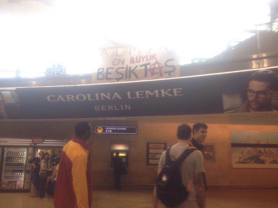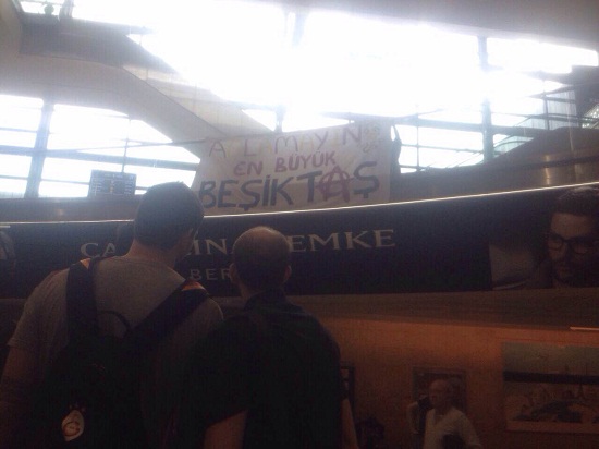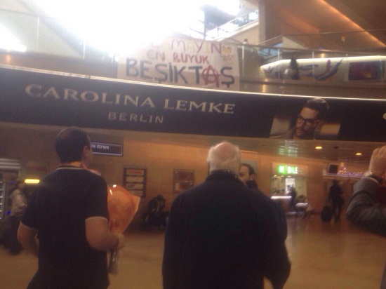 İsrail'deki havaalanına giren Beşiktaşlı taraftarlar G.Saraylı oyuncuların çıkış yapacağı yol üzerine, "Ağlamayın. En büyük Beşiktaş" yazılı pankart astı.