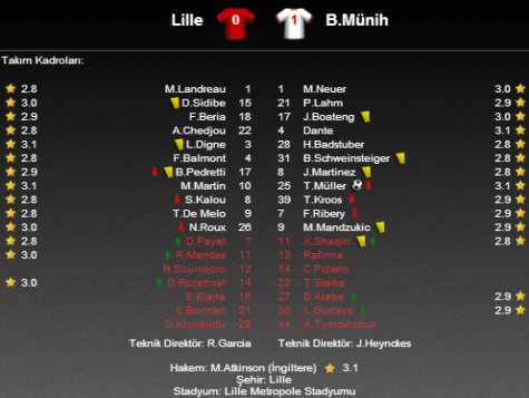 Bayern Münih'te maça 11'de başlayan Fransız yıldız Franck Ribery eski takımı Lille'e karşı forma giyerken 45 dakika sahada kaldı. Ribery'nin yerine ikinci yarıda oyuna Xherdan Shaqiri girdi.