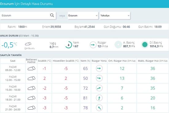 Meteoroloji Genel Müdürlüğü, Erzurumspor - Galatasaray maçı saatinde hava sıcaklığının eksi 3, hissedilen sıcaklığın ise eksi 5 derece olacağını açıkladı.