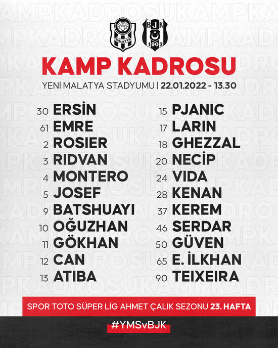 Spor Toto Süper Lig'de Yeni Malatyaspor deplasmanına konuk olacak Beşiktaş'ın kamp kadrosu belli oldu.