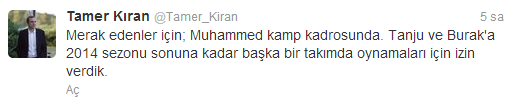 Beşiktaş Futbol Komitesi Başkanı Tamer Kıran, şahsına ait twitter adresinden yaptığı açıklamada Muhammed Demirci'nin kamp kadrosunda yer alacağını belirterek bir anlamda genç oyuncu ile ilgili yapılan dedikoduları yalanlarken siyah beyazlı ekipte geleceği belirsiz olan Burak Kaplan ve Tanju Kayhan'ın ise 2014 yılı sonuna kadar başka bir takımda oynamasına izin vereceklerini söyleyerek bu iki isim hakkında da yönetim politikasını ortaya koymuş oldu.