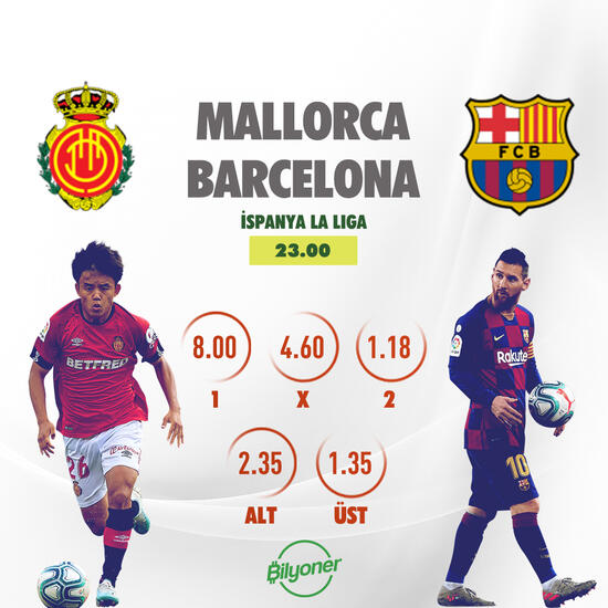 İspanya La Liga'nın 28. hafta mücadelesinde Mallorca ile Barcelona karşı karşıya geliyor. İki takımın bu kritik maçı öncesinde Bilyoner.com'dan yapacağınız kuponlarda size küçük ipuçları hazırladık. Bu maça Bilyoner.com'dan hemen oynamak için şu bağlantıyı kullanabilirsiniz. Ayrıca karşılaşmayı Bilyoner'de canlı olarak izleyebilirsiniz.