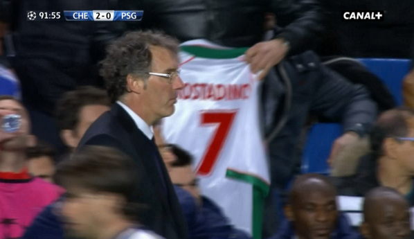 Chelsea taraftarı, müthiş zaferin ardından kutlamalara başlarken Blanc'ın arkasındaki bir taraftarın Bulgar efsanesi Emil Kostadinov'un formasını tribüne getirdiği görüldü. Bunun nedeni ise PSG'nin Fransız teknik adamı Laurent Blanc'ın futbolcu olduğu dönemde yaşadığı bir travmayı hatırlatmaktı.
