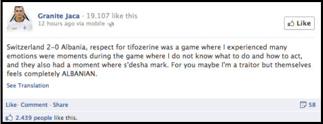 Salı gecesi kendisinin doğduğu ülke olan Arnavutluk karşısında İsviçre milli takım formasıyla mücadele eden oyuncu, Facebook üzerinden yaptığı açıklamada, maçta ne yapacağını bilemediği duygusal anlar yaşadığını ve yaşadığı kimlik krizi sebebiyle yakaladığı gol fırsatını kendi isteğiyle değerlendirmediğini söyledi.