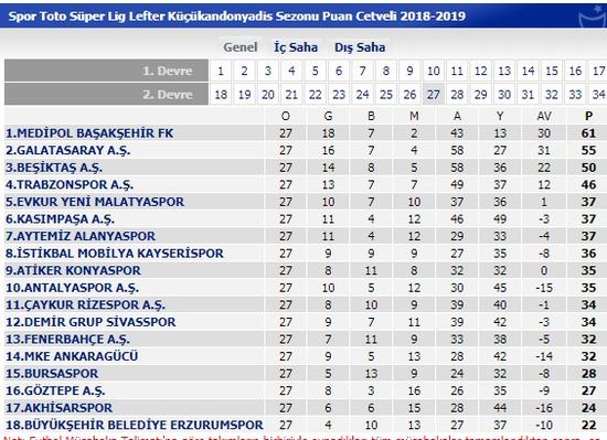Süper Lig'de 27. hafta maçlarının ardından oluşan puan durumu şöyle: