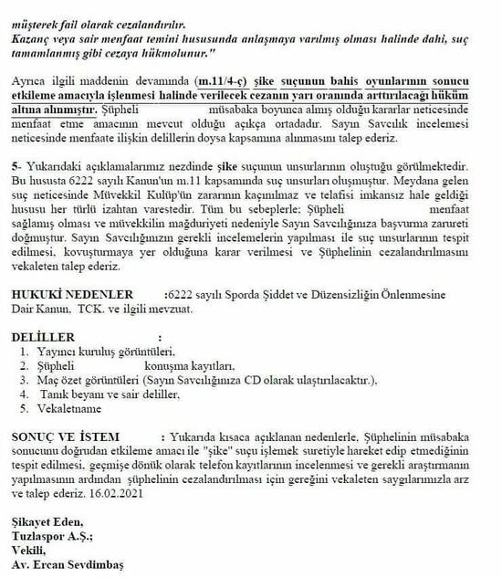 Yan hakemin bayrak kaldırmadığı, orta hakemin ise ısrarla sonucu golle biten bu pozisyona girerek ofsayt demesi resmen skandaldır. Buradan tüm spor kamuoyuna deklare ediyoruz; eğer bu pozisyonun ofsayt olduğu ispatlanırsa bu takımı derhal 1.Lig'den çekeceğiz. İspatlanmazsa hakkımızı sonuna kadar arayacağız. Tuzlaspor'un sabrını kimse sınamasın! Türk adaletinin savcılarını göreve davet ediyoruz. Bu hakemin telefonları geçmişe doğru incelenmeli ve konuşmalarının dokümanları çıkarılmalıdır. Bu hakem bahisçi midir? Bu maç için birileriyle pazarlık yapmış mıdır?