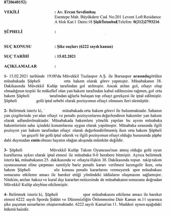 TFF 1. Lig'de Bursaspor ile Tuzlaspor arasında oynanan ve 0-0 mücadele için flaş bir başvuru geldi. Tuzlaspor Kulübü, maçta şike yapıldığı iddiasıyla İstanbul Anadolu Yakası Cumhuriyet Başsavcılığı'na şikayette bulundu. Tuzlaspor Kulübü, maçın orta hakemi Yasin Kol, yardımcılar Serdar Diyadin ve Uygar Bebek, dördüncü hakem Murat Türkoğlu hakkında şike yapıldığı gerekçesiyle suç duyurusunda bulundu.