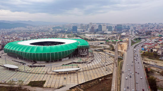 Bursa Büyükşehir Belediyesinden yapılan açıklamaya göre, belediye tarafından inşa ettirilen, 400 bin metrekare proje ve 190 bin metrekarelik inşaat alanıyla kentin en büyük anıtsal yapılarından biri olan, takımın simgesiyle özdeşleştirilerek timsah görünümündeki stadyumda bu figürün başını oluşturan bölümün inşası tekrar başladı.