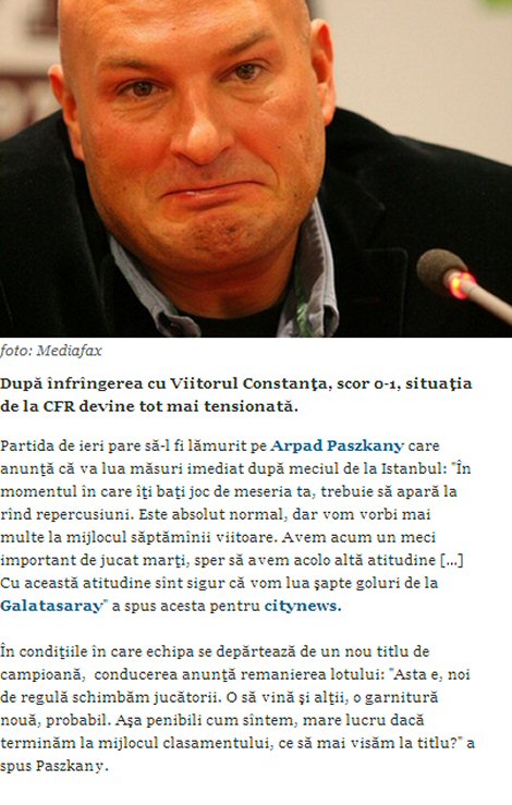 Kısa bir süre önce Andone'den mutsuzluğunu dile getiren Cluj'un patronu Arpad Paszkany, Hagi'nin takımına mağlup olan ekibine göndermede bulunarak, "Salı günü daha farklı bir oyun bekliyoruz. Hafta ortasında daha fazla konuşacağız. Bu oyunla Galatasaray bize 7 tane atabilir, emin değilim." şeklinde konuştu.