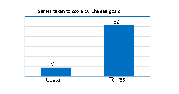 Brezilya doğumlu İspanyol yıldız, 9 maçta 10 gol atma başarısı gösterirken Fernando Torres bu sayıyı Chelsea formasıyla çıktığı 52. maçında yakalayabilmişti.